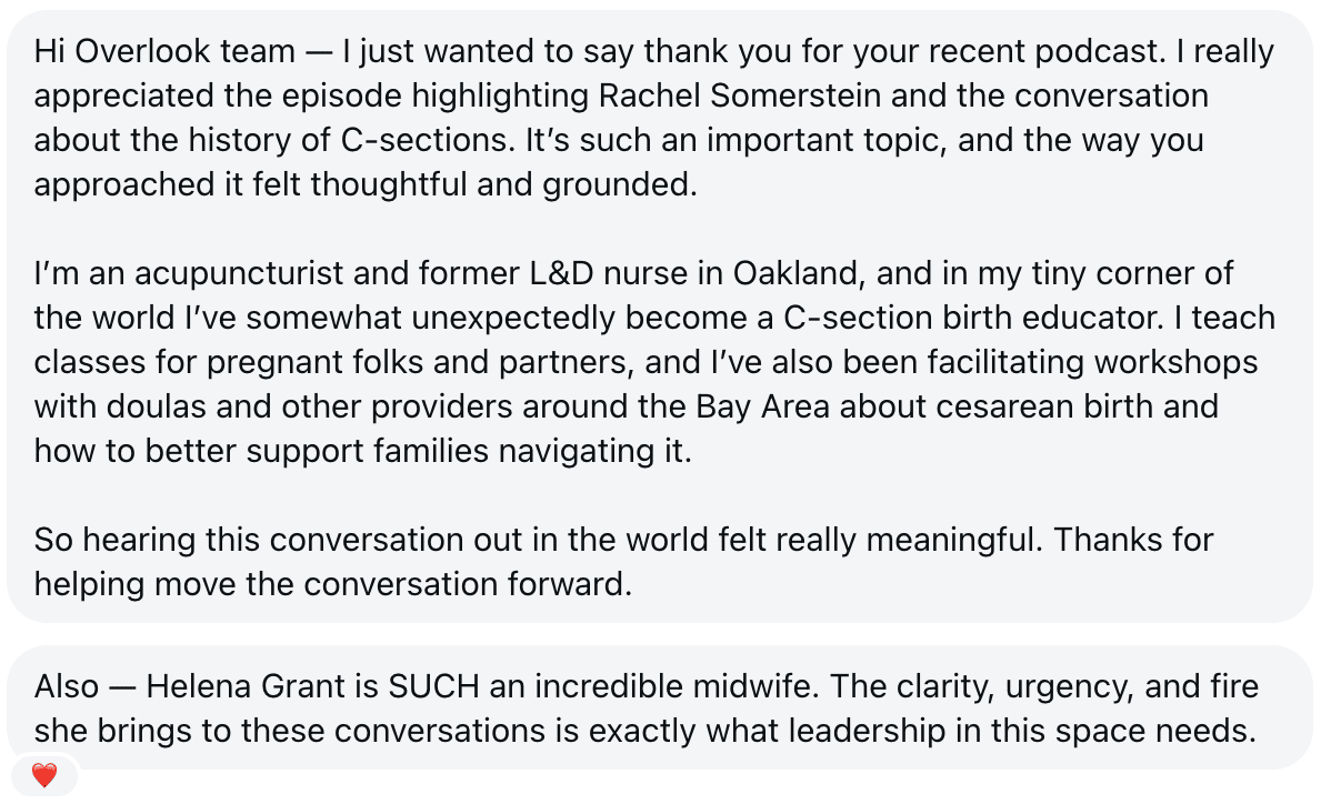 It seems like the episode about cesarean births really resonated with so many of you, and I’ve had some wonderful, enriching conversations about how it brought to mind a range of memories and experiences for people. Here are some of them: this first one is from a listener in Oakland, Brianna Darcey, who got in touch on Instagram. And then, my friend and collaborator Aarti Vaid Pedersen commented on a post I wrote for LinkedIn about my own experience: Aarti and I also spent some time talking about switching our language from ‘c-section’ to ‘cesarean birth’, and how intentional you have to be to make that switch. In the episode, Helena Grant pointed out that the term c-section was medicalized language, and she preferred calling it 'cesarean birth' - and I do think language matters. And then also on LinkedIn, Joanne Griffiths messaged me: Joanne and I instantly got into a really wonderful exchange, past the pleasantries (and on LinkedIn!) and into what really matters when it comes to the legacy of cesarean birth. Joanne’s point about not talking about it because ‘it turned out alright’ really resonated with me. I held back for many years because I figured that’s how people would inevitably react. And really, we want to move past these difficult experiences, don’t we? But all these years later, it seems like actually yes, we still want and need to talk about what happened, and what our bodies still hold on to. I know I do. It moves me to have these conversations and hear these stories. It shapes my questions as a journalist, and influences the kind of topics I do on the show as well, so I’m grateful to you guys for getting in touch. If you want to share your story, email or send me a voice memo: hello@overlookedpod.com. Next week's we're publishing a 'hidden history' episode, for Women's Health Month - an episode that will make you realize that history is still being written, and how much further we have to go. I think you'll like it! Wishing you the best of health, Golda |