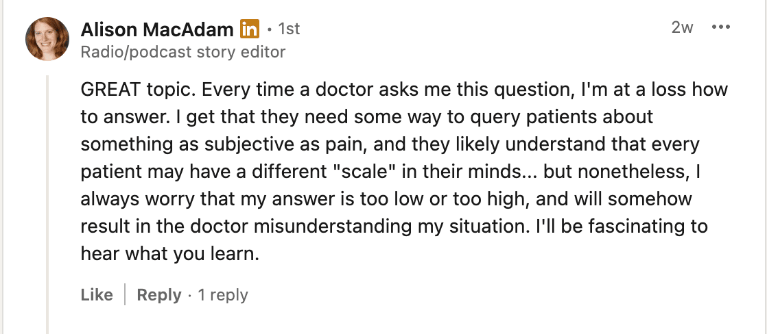 Join the conversation on LinkedIn, or reply to this email with your experiences of the pain scale.